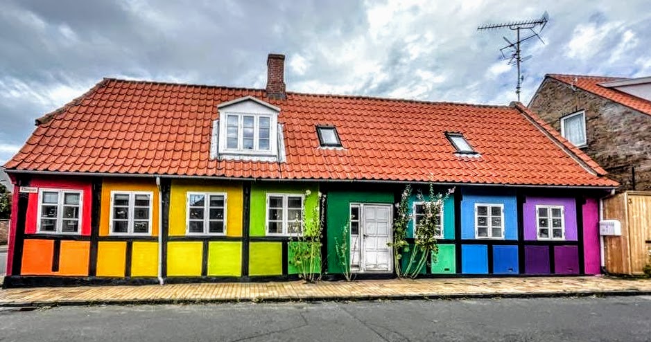 Sålænge det står solo – for jeg tror ikke vi ville kunne lide en hel by med huse i så larmende farver. Men her på Hjørnet af Søndergade og Almegade i Rønne, lyser det op på en måde, der bringer smil og spontane kommentarer frem hos både lokale og turister.