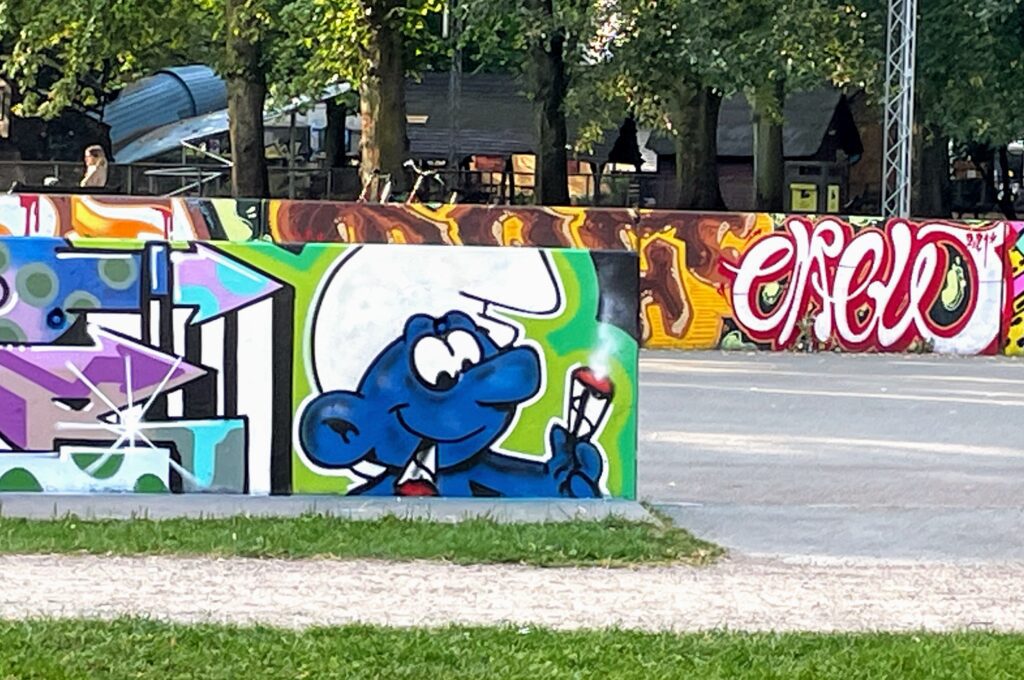 Tænk, at nogen har brugt tid og kræfter på at male en smølf her – og netop her sidder den selvfølgelig med en joint i hånden, hvilket næppe har været den originale tegners mening, da han i sin tid skabe smølfernes univers.
